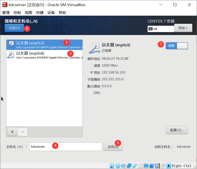 逐一开启两块网卡(网卡1和网卡3都设置为打开状态),设置主机名,并点击应用,点击【完成】按钮,完成设置(不必进入配置页面继续配置,后期将通过 linux命令具体配置)。