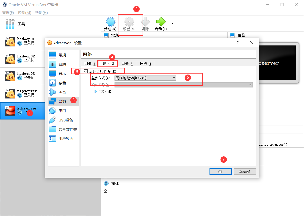 选择【网卡2】页签开启第2块网卡用于虚拟机连接互联网,第2块网卡设置如下: