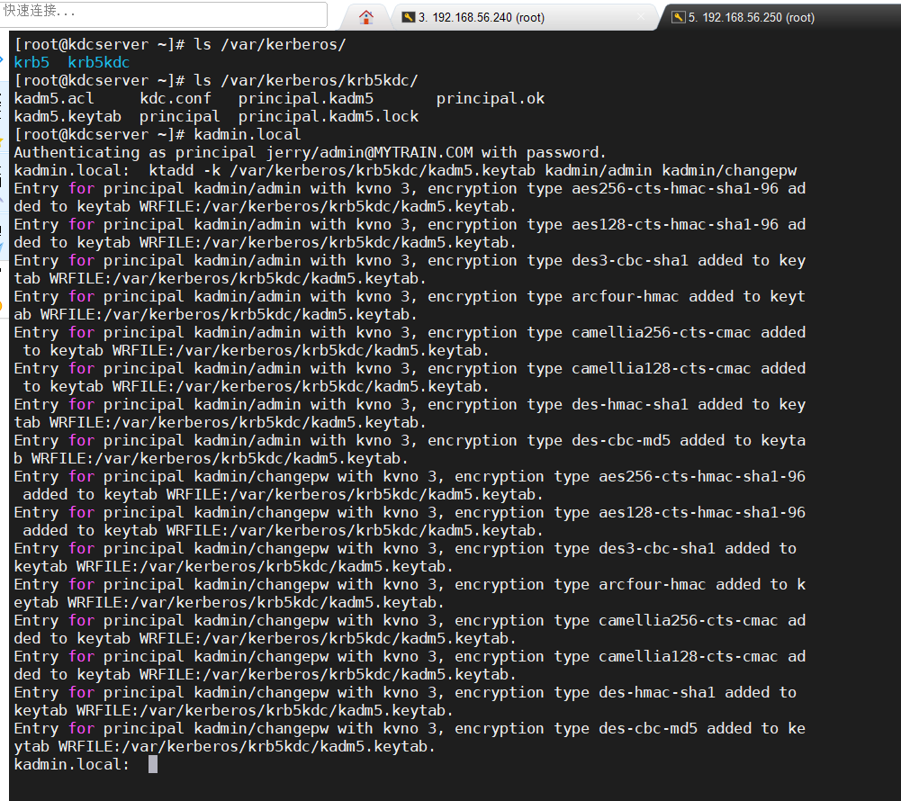 kadmin.local:ktadd -k /var/kerberos/krb5kdc/kadm5.keytab kadmin/admin kadmin/changepw