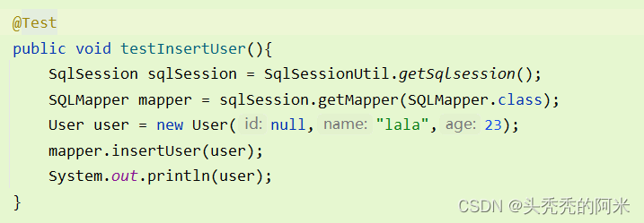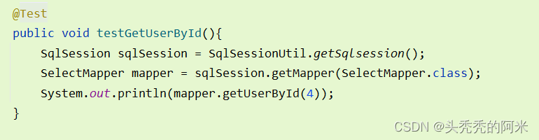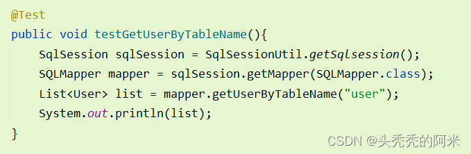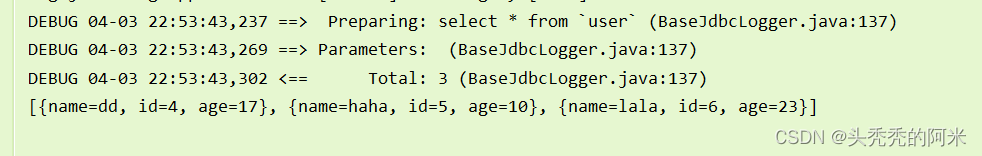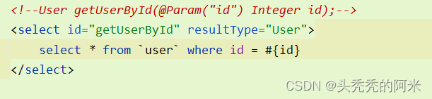 mapper接口中定义方法: //查询所有用户信息 List<User> getAllUsers(); mapper.xml文件中: <!--List<User> getAllUsers();--> <select id="getAllUsers" resultType="User"> select * from `user` </select>输出结果: