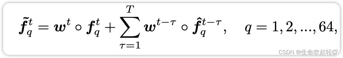 考虑到当前帧目标可能遮挡或者模糊,之前帧传播的特征可以融合到当前帧特征上来增强表示。当前帧特征为f t f^tft,之前帧传播的特征为f ^ t − τ \hat{f}^{t-τ}f^t−τ,加权求和的增强特征通过以下公式计算得到: