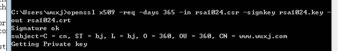 openssl x509 -req -days 365 -in rsa1024.csr -signkey rsa1024.key -out rsa1024.crt