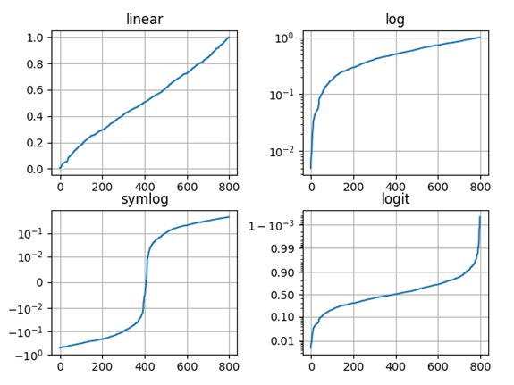 plt.xscale('log')下面显示了 y 轴具有相同数据和不同尺度的四个绘图示例: