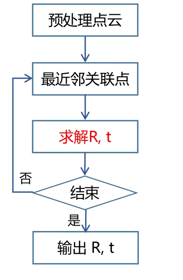 其中R和t分别为两帧点云的旋转与平移矩阵;通过不断的迭代求解出两帧点云相对平移与旋转
