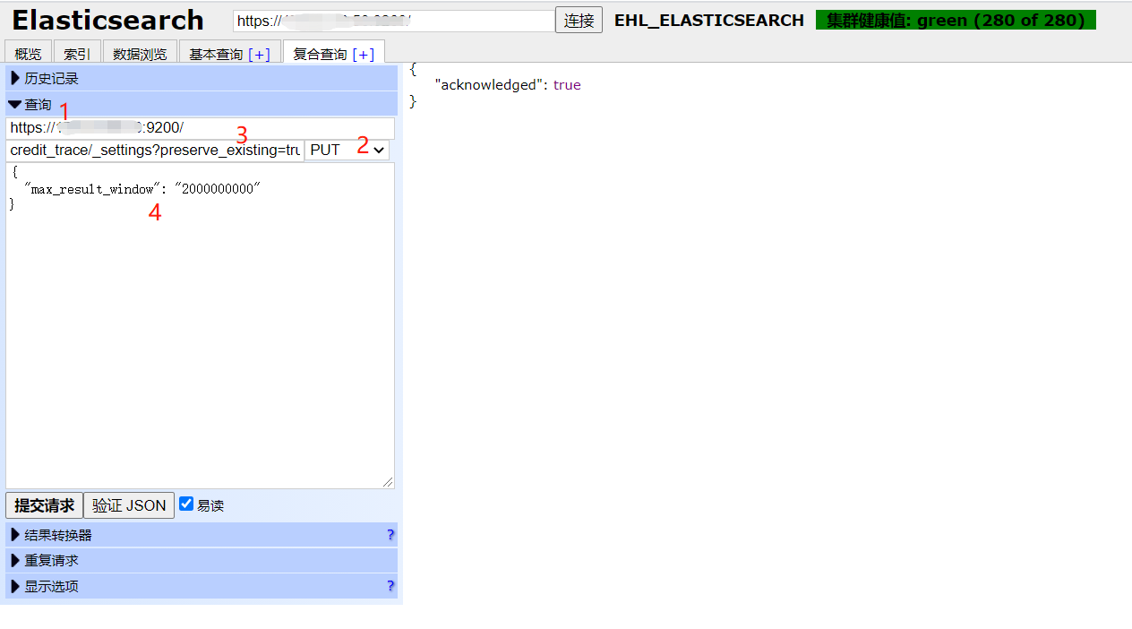 最后点击提交请求,如果配置正确右侧窗口会显示如下{acknowledge:true}