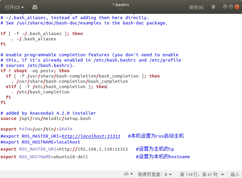 如下图所示,即加入图中高亮的两行即可。即将ROS_MASTER_URI指向主机的ip,其中192.168.1.110需要设置为主机的ip,端口11311不需要改。ROS_HOSTNAME设置为本机的hostname(如果不知道这里的hostname怎么设置,可以看一下上一篇博文),实在不行的话,直接把export ROS_HOSTNAME=ubuntu18-dell(your hostname)注释掉也可。
