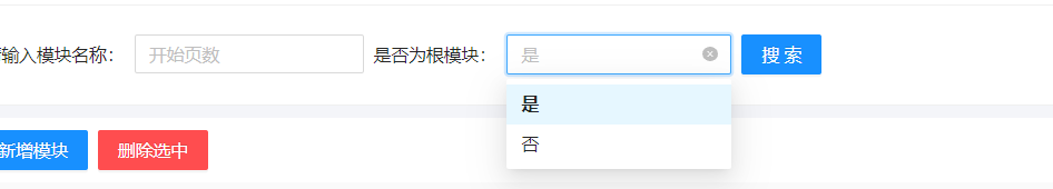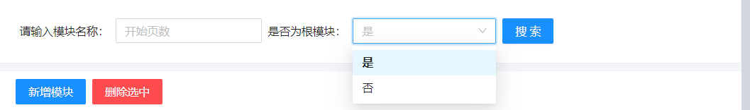 是否为根模块,有两个选择项,是和否,我们希望这个数据在页面刚开始加载的时候可以从后台接口中获取,并且渲染到Select上去