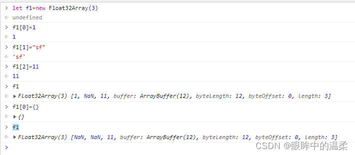 f3 // [1, NaN, NaN, NaN]可以看到,类型数组可以将普通数组中的非数字类型的数据赋值为NaN;所以这算是类型数组的一个应用场景。