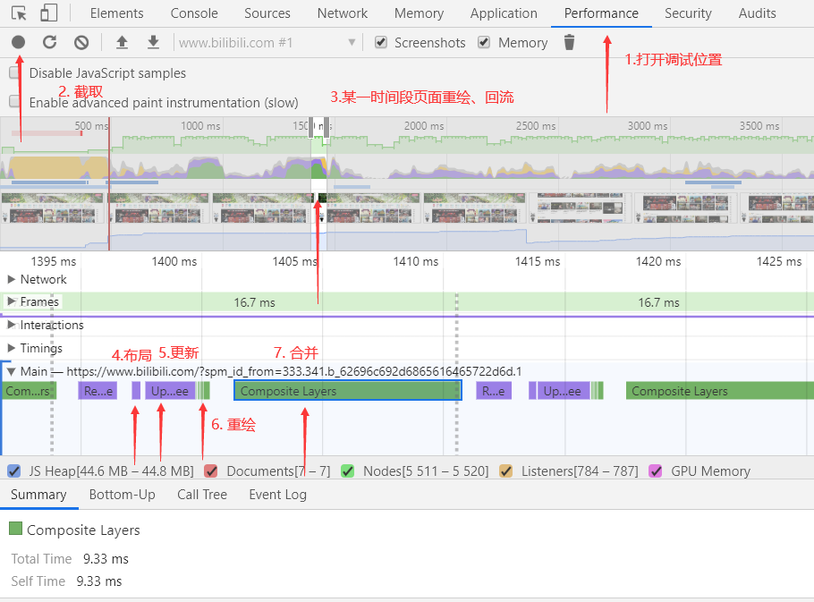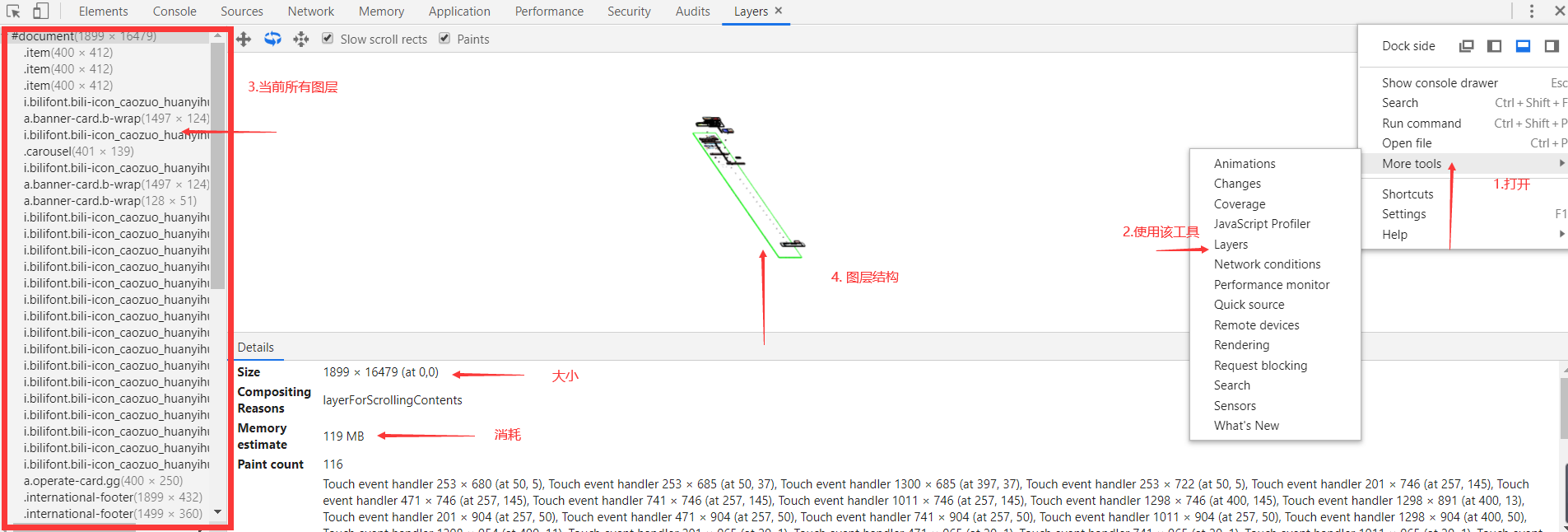 因此,将频繁重绘回流的DOM元素单独做为一个独立图层,该DOM元素的重绘和回流的影响只会影响这个图层,但是当图层太多,将会导致图层合并Composite Layers时间太长。除此之外,Chrome也存在创建图层条件:3D或透视变换CSS(transform 、perspective)、视频编码(video)、3D上下文或者加速的2D上下文的节点(WebGL 和 Canvas)、混合插件(Flash)、对opacity元素做动画或者使用一个动画webkit变换的元素、拥有加速CSS过滤器的元素、元素拥有子元素(子元素有属于自己的图层)、元素拥有z-Index属性且包含符合层的兄弟元素(图层上下位关系)。图层查看方式: