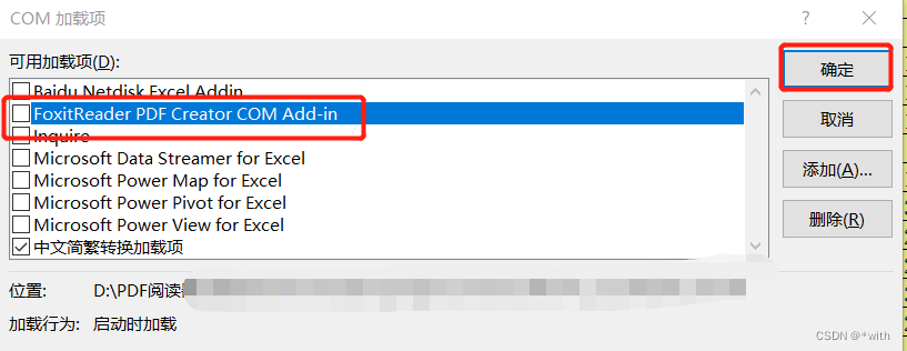 打开任意一个Excel文件,点击文件 —— 选项 —— 加载项 —— 点击下方的管理旁边的下拉菜单,选择COM加载项 —— 点击转到 —— 把福昕阅读器的前面的勾去掉,然后确定。