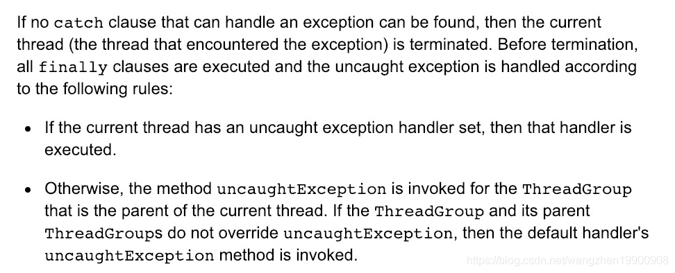 关于 JVM 先调用 UncaughtExceptionHandler 然后把发生未捕获异常的线程停止掉的说法,见于 Java Language Specification 11.3,如下所示的片段: