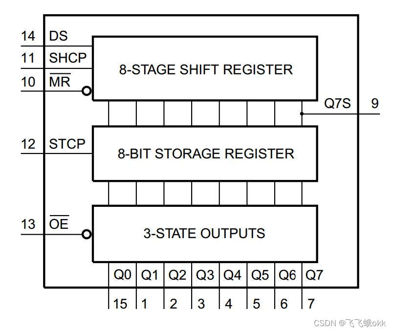Ds数据输入端串行输入时,在SHcp的上升沿将数据移入移位寄存器内,每个SHcp上升沿移入一位单bit数据,最先输入的一直向后移直到8个SHcp上升沿后,移位寄存器填满,此时若数据输入端还有数据输入,下一个SHcp上升沿到来时,最先输入的1bit数据就会从Q7'输出(此处可理解为队列,先进先出)。在STcp的上升沿,数据会从移位寄存器进入存储寄存器中,当OE低有效时,存储寄存器中的值从Q0~Q7并行输出。