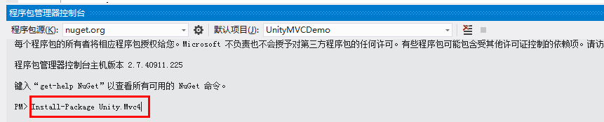 首先我们需要新建一个UnityMVCDemo项目(ASP.NET MVC4.0),选择工具-库程序包管理器-程序包管理控制台,输入“Install-Package Unity.Mvc4”命令,VS2010可能需要先安装NuGet。