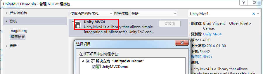 或者通过工具-库程序包管理器-管理解决方案的 NuGet 程序包,通过联机搜索“Unity.Mvc4”进行安装。