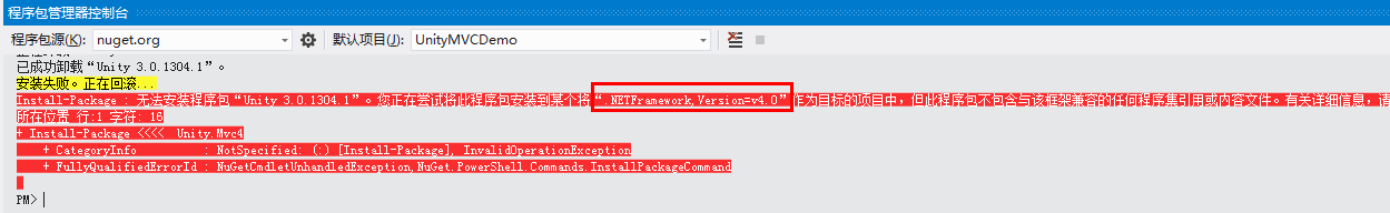 根据异常信息,可以肯定是项目的.net framework版本无法安装Unity,这种安装VS会自动搜索Unity最新版本,但是最新版本往往有. net framework版本要求,不知道有没有指定Unity版本安装,可以看到我们安装的是Unity3.0版本,修改一下项目. net framework的版本为4.5,重新安装就可以了。