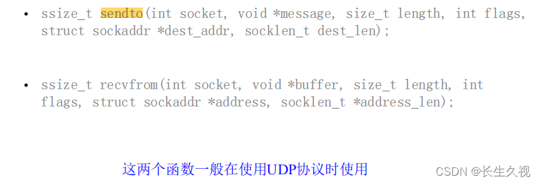 五、基于套接字的UDP通信流程相关函数,其他函数与TCP一致,主要是收发数据(sendto/recvfrom)。