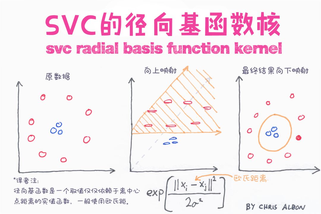 径向基核(radial basis function, RBF)可用于非线性可分变量。使用平方欧几里德距离,参数的典型值会导致过度拟合。sklearn中默认使用RBF。