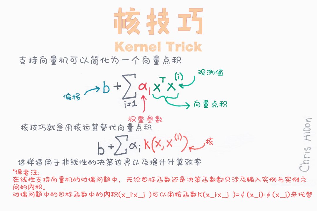 SVM中超平面的学习是通过将问题转化为使用一些某种线性代数转换问题来完成的。(上图的例子是一个线性核,它在每个变量之间具有线性可分性)。
