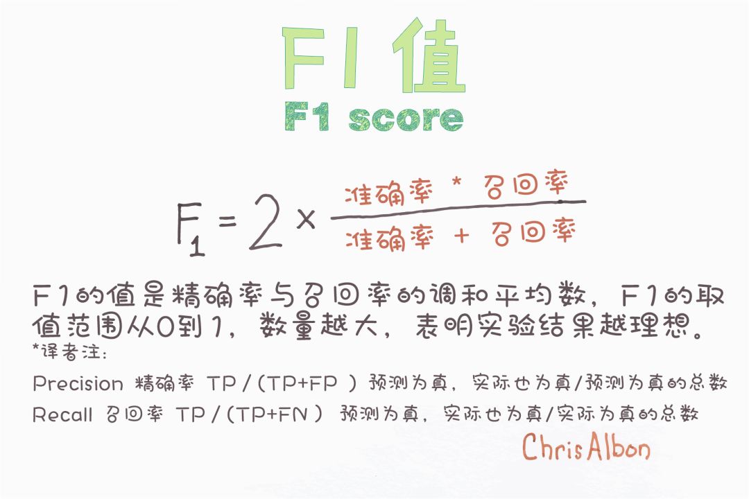 普通的通常均值将所有的值平等对待,而调和平均值给予较低的值更高的权重,从而能够更多地惩罚极端值。所以,如果精度和召回率都很高,则分类器将得到很高的F-1值。