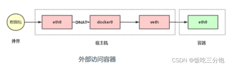当浏览器输入192.168.32.130:80(数据包),在宿主机这里数据包的目的地址(192.168.32.130:80)会被iptables利用DNAT(目标网络地址转换)转换成172.17.0.3:80,并查询路由表得到对应的网卡,网卡发送ARP广播,最后找到对应的容器.
