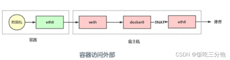根据路由表得到网卡,根据网卡到达宿主机,在宿主机这里会被iptables利用SNAT(源地址转换)转换成宿主机ip,然后转发到默认网关(宿主机网关),借助宿主机的网络访问互联网。