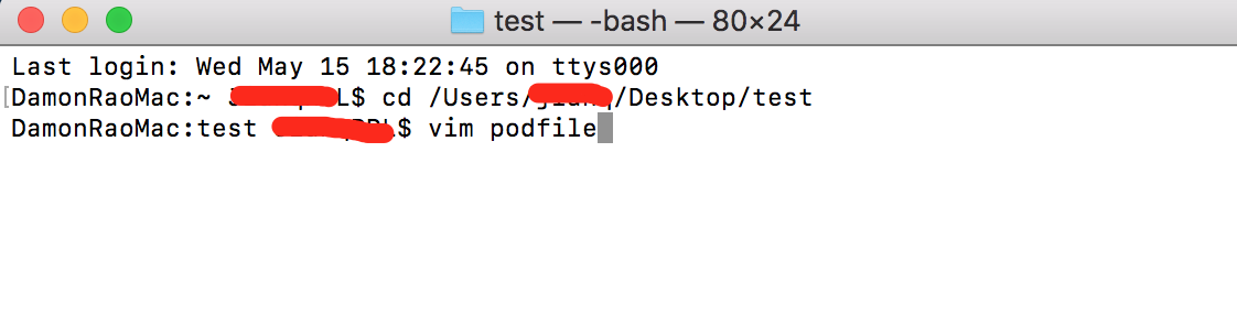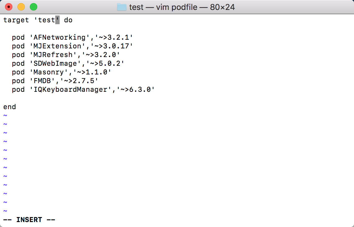 然后 按下esc 键,再输入 : 号,最后 输入 wq 回车退出编辑界面(此后就可以直接在工程中编辑podfile)