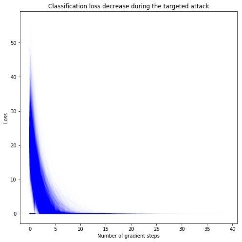 由于我们有很多图像,我们可以在攻击成功的早期添加一个停止标准。当记录损失小于0.001时,停止攻击是相当合理的,在实践中可以明显加速。参考这个图表: