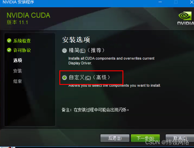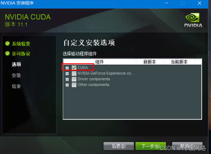 3、下载完打开安装程序,安装路径选择自定义,自定义选项,选择cuda 打勾,然后一路下一步安装完成
