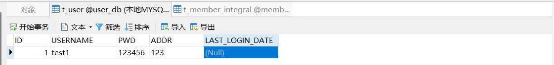 CopyINSERT INTO `user_db`.`t_user`(`ID`, `USERNAME`, `PWD`, `ADDR`, `LAST_LOGIN_DATE`) VALUES (1, 'test1', '123456', '123', NULL);