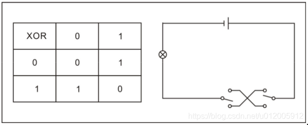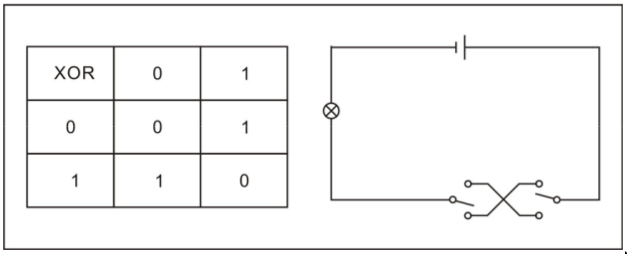说明:看图 1-6,这是一个交叉电路图,只有两个开关一上一下时,灯泡才会亮。