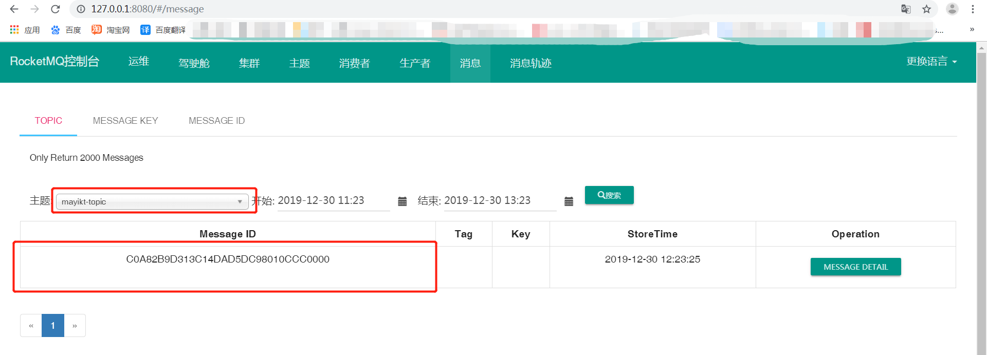 然后在RocketMQ的控制台的消息里面,选择主题:mayikt-topic