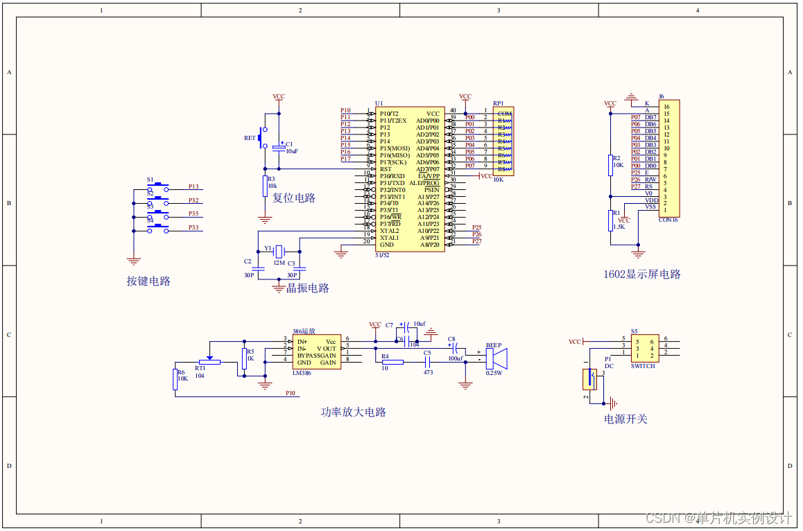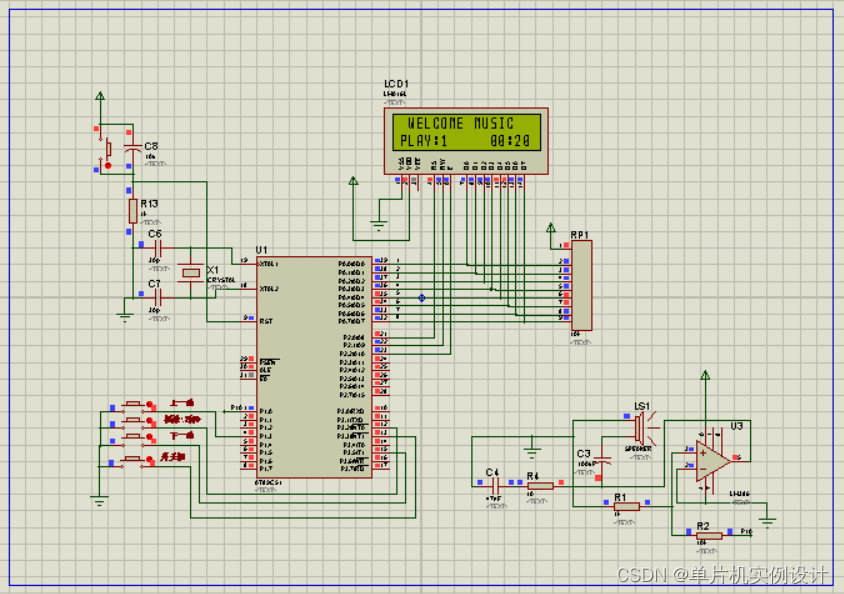 本文将介绍一种以51单片机为基础元件设计,LCD1602液晶屏进行显示的自动音乐播放器。整体电路主要由51单片机最小系统,LCD1602液晶显示模块,LM386功率放大电路,喇叭,按键模块;整体原理图如图: