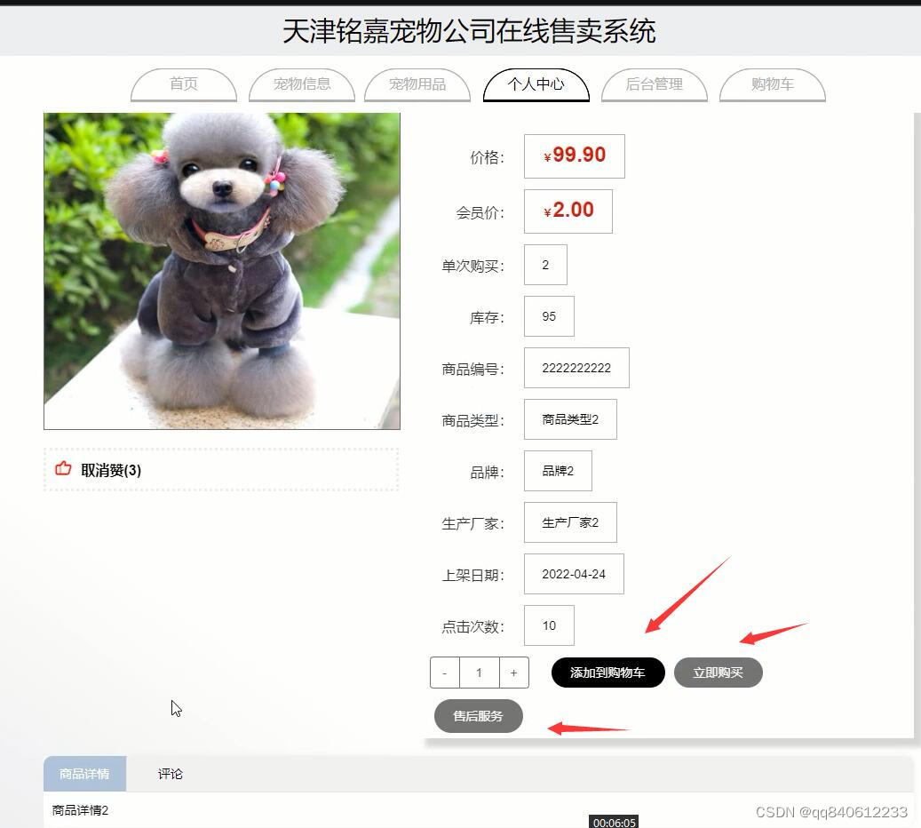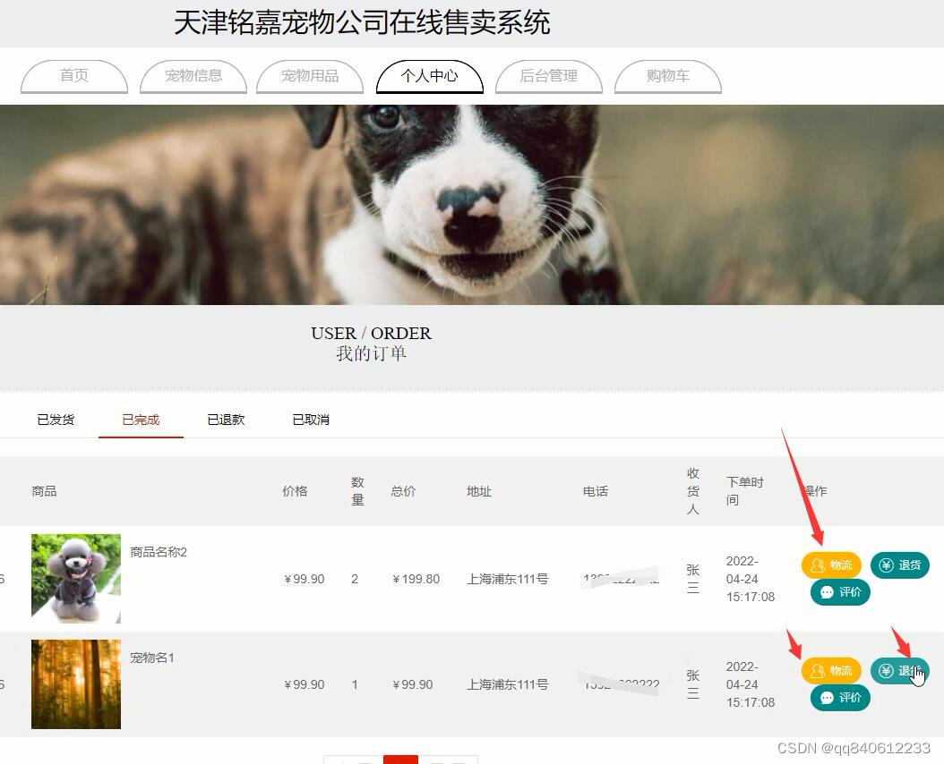,实现宠物公司在线售卖系统中的用户、宠物信息、宠物用品、售后服务、售后处理、订单信息等功能。