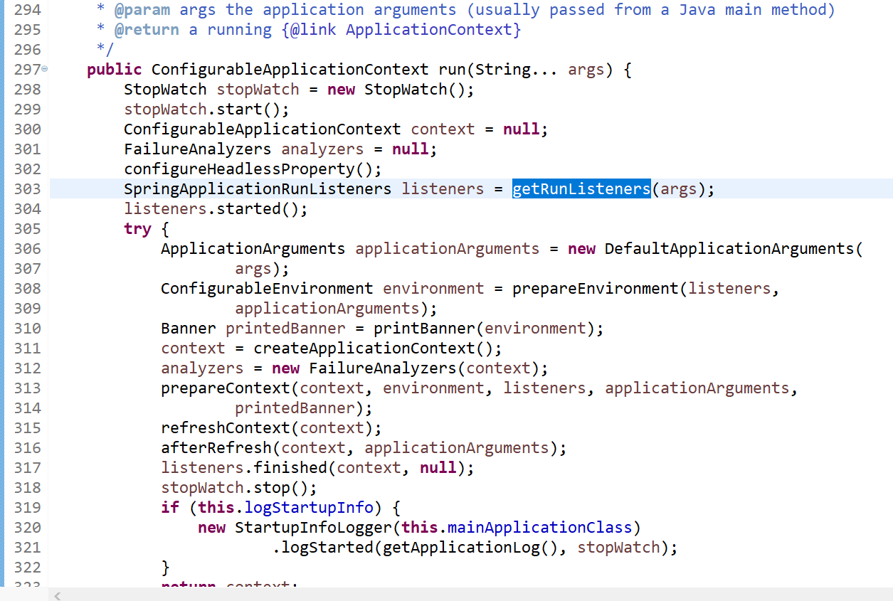 这个过程,应用的监听器SpringApplicationRunListeners并开始监听,加载SpringBoot配置环境(ConfigurableEnvironment),如果是通过web容器发布,会加载StandardEnvironment,其最终也是继承了ConfigurableEnvironment,配置环境(Environment)加入到监听器对象中(SpringApplicationRunListeners),建run上下文对象ConfigurableApplicationContext(应用配置上下文),prepareContext方法将listeners、environment、applicationArguments、banner等重要组件与上下文对象关联,refreshContext(context)方法(初始化方法如下)将是实现spring-boot-starter-*(mybatis、redis等)自动化配置的关键,包括spring.factories的加载,bean的实例化等核心工作。