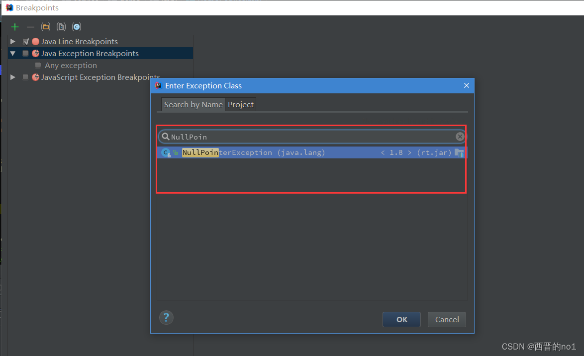 如图6.6,点击+号添加Java Exception Breakpoints,添加异常断点。然后输入需要断点的异常类,如图6.7,之后可以在Java Exception Breakpoints里看到添加的异常断点。