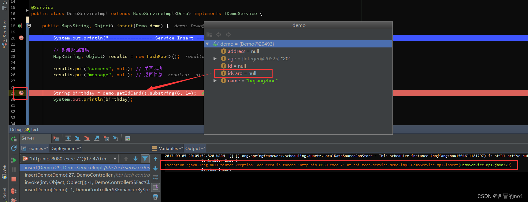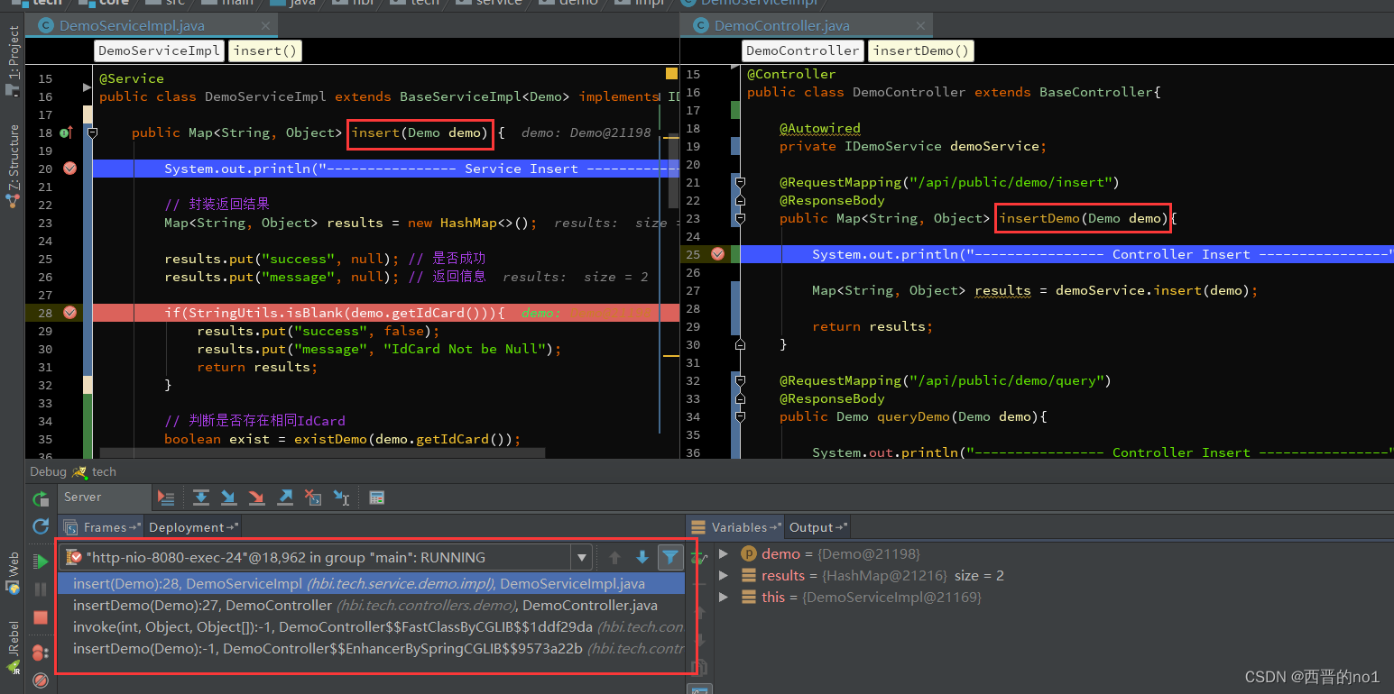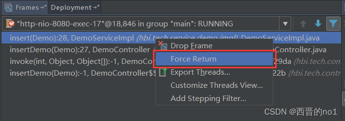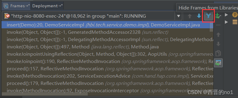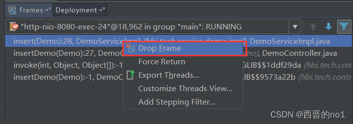 1、首先认识下这个方法调用栈,如图8.1,首先请求进入DemoController的insertDemo方法,然后调用insert方法,其它的invoke我们且先不管,最上面的方法是当前断点所在的方法。