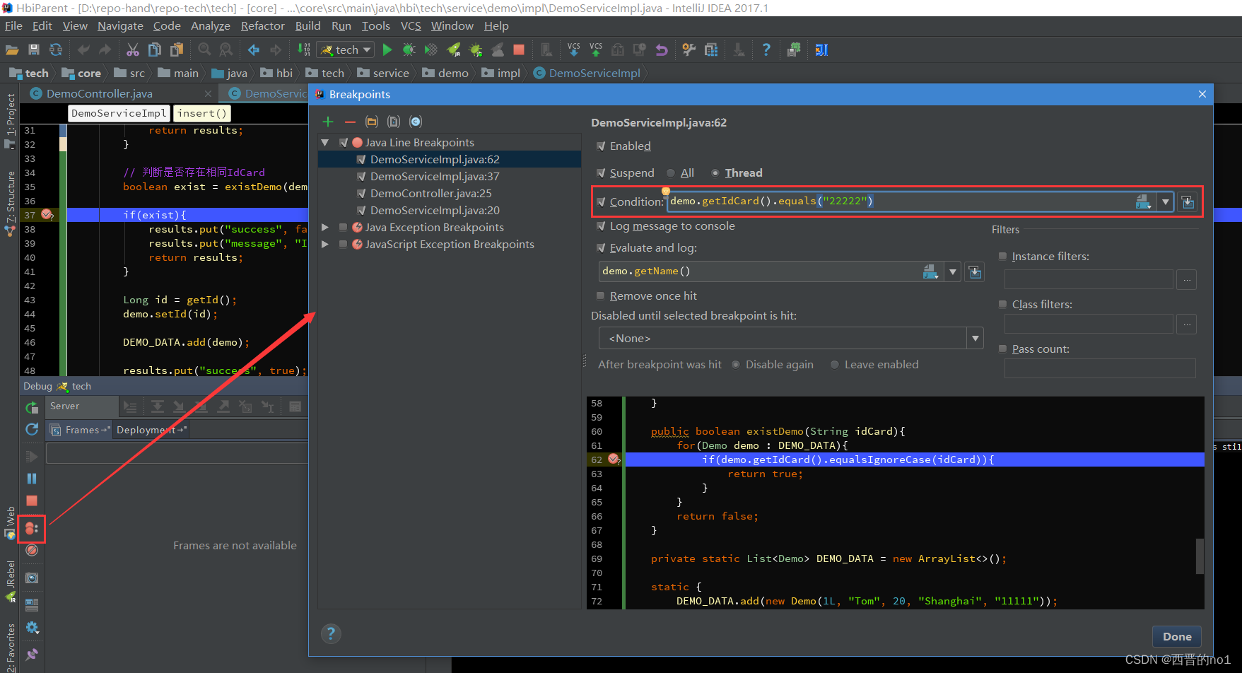 Java Line Breakpoints 显示了所有的断点,在右边勾选Condition,设置断点的条件。
