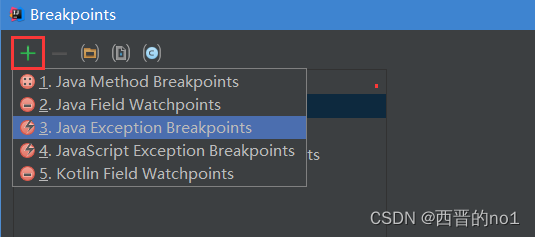 4、异常断点,通过设置异常断点,在程序中出现需要拦截的异常时,会自动定位到异常行。