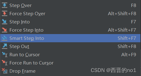 > Force Step Into (Alt + Shift + F7):强制步入,能进入任何方法,查看底层源码的时候可以用这个进入官方类库的方法。