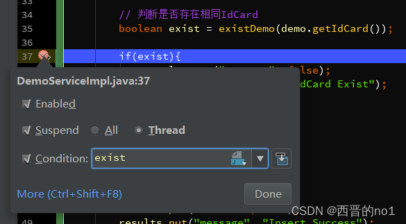 1、在断点上右键直接设置当前断点的条件,如图6.1,我设置exist为true时断点才生效。