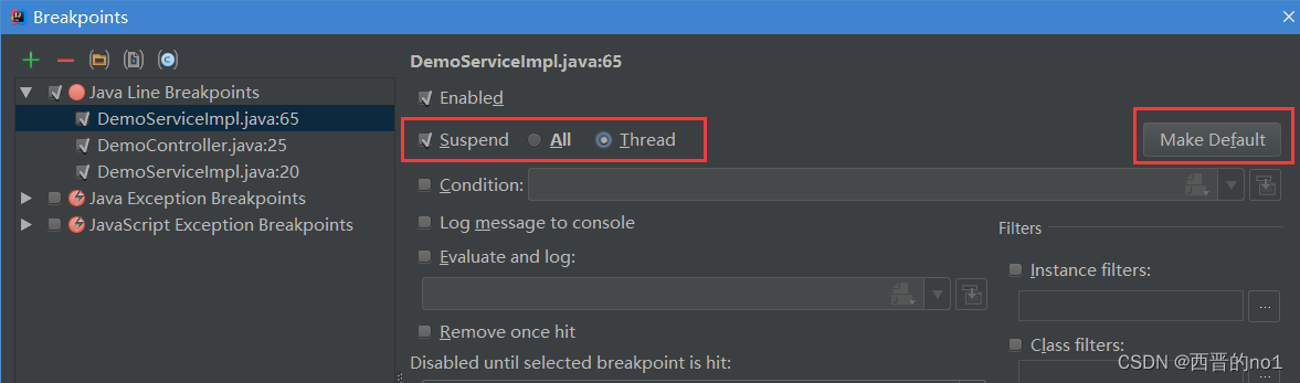 那是因为IDEA在Debug时默认阻塞级别是ALL,会阻塞其它线程,只有在当前调试线程走完时才会走其它线程。可以在View Breakpoints里选择Thread,如图7.1,然后点击Make Default设置为默认选项。