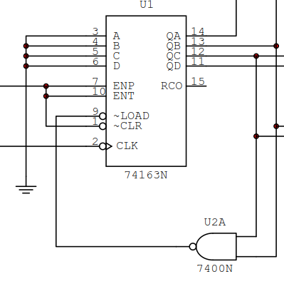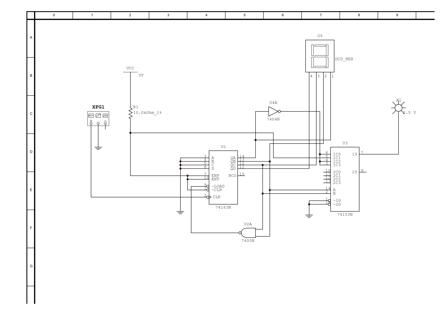 (由于multisim7中只有74163, 故这里用74163替代74161) 如此设计后, 电路共有7个状态(都是有效状态)0000、0001、0010、0011、0100、0101、0110, 且按照0000->0001->0010->0011->0100->0101->0110变化. 在设计输出信号时, 只需要用到74163的低三位输出即可.