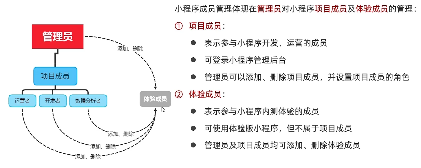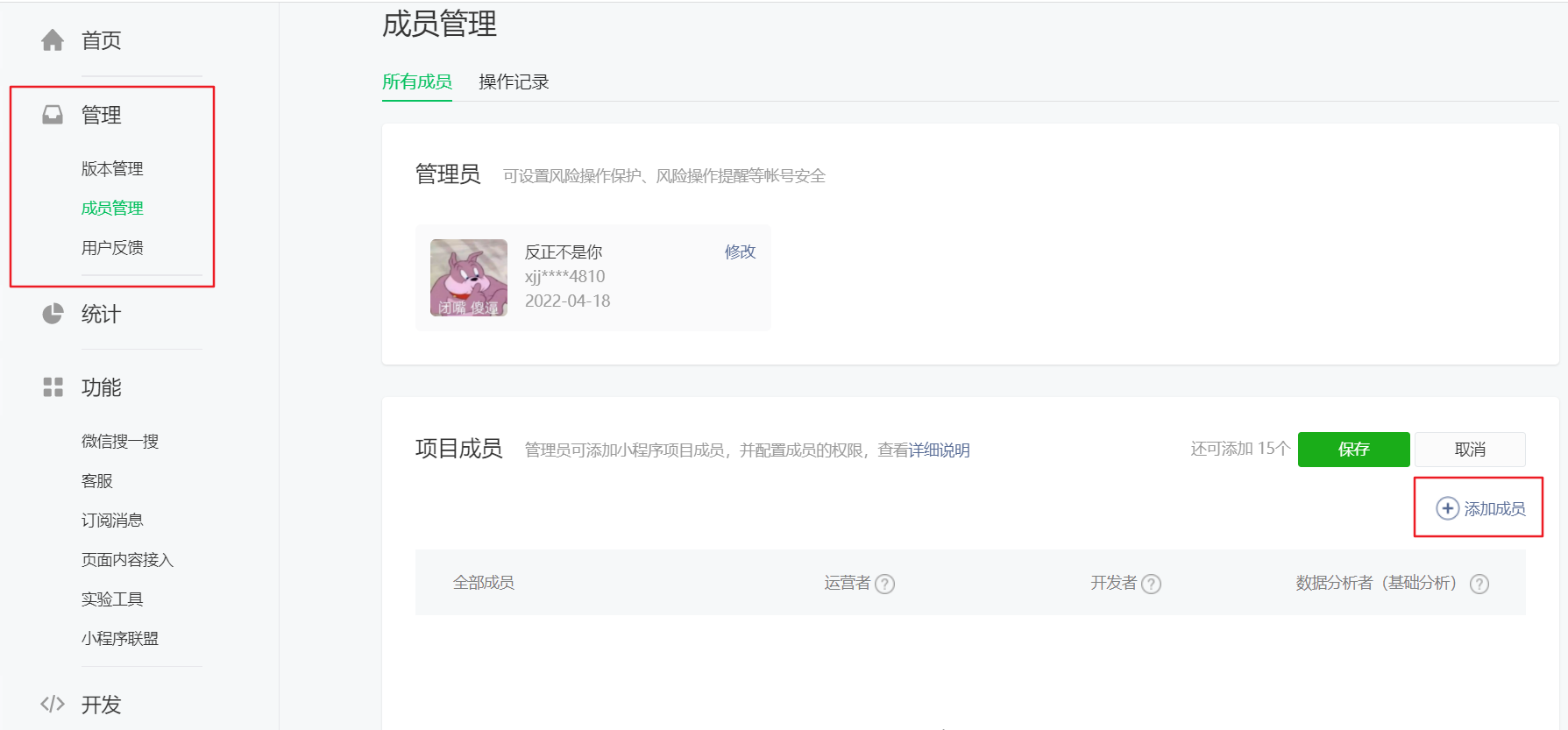 打开开发者工具点击管理找到成员管理就可以添加项目成员和体验成员: