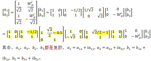 上图中,符号X代表实数,O代表复数。线相连的O两个代表互为共轭的两个复数。在变换过程中,保持线相连的互为共轭的两个复数的共轭性,以上4类蝶形运算的实数形式如下:
