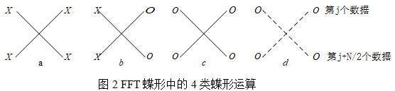 (4) 图2(d)形式的蝶形变换称为虚蝶。只要在正变换时,先计算主蝶的结果,再对其取复共轭赋值给虚蝶;反变换时,先重建主蝶,再对主蝶的重建值取共轭赋值给虚蝶。