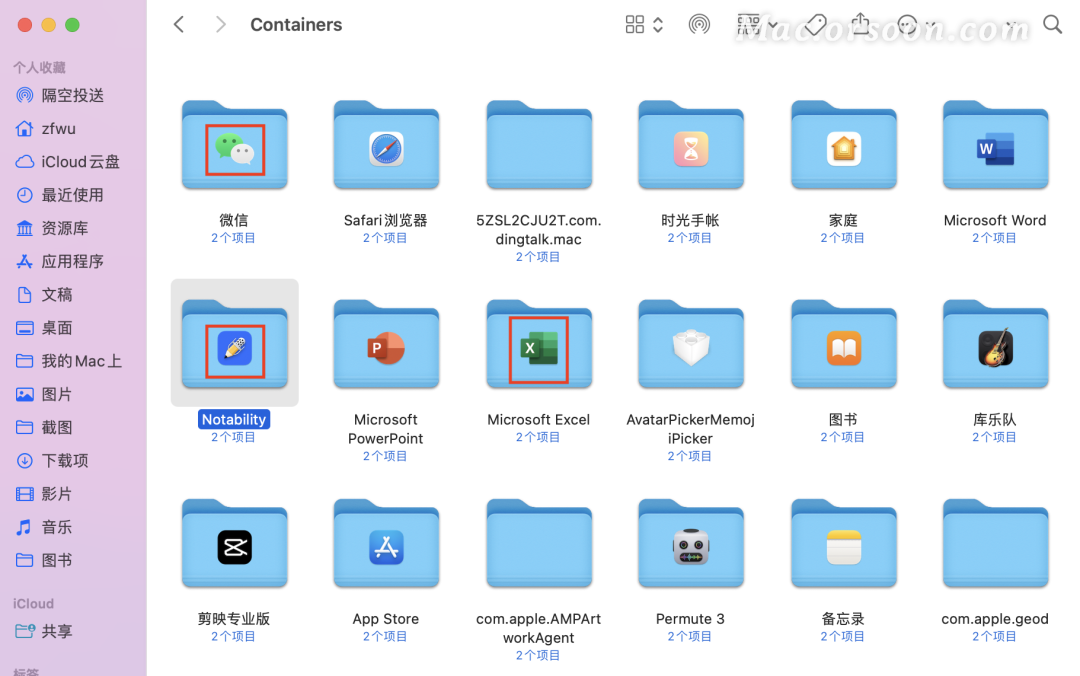 在Containers文件夹下,你可以通过图标认出其是属于哪一个应用。并且还会意外发现此前已经卸载过的软件留下的应用残余,对于这些放心删除。(建议排序方式修改为大小,可以快速找到占用比较多的应用数据,方便清理。)