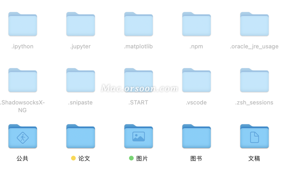 Mac OS有大量的应用数据在默认情况是隐藏的(浅颜色为隐藏文件夹),可以通过快捷键(Command+Shift+.)显示隐藏文件。