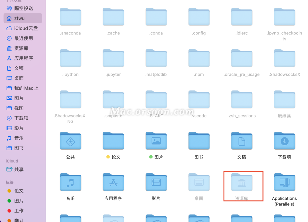 在访达中使用快捷键(Command+shift+H)进入用户文件夹,再通过快捷键(Command+Shift+.)显示隐藏文件夹,找到用户文件夹下的资源库。(Mac OS共有三个资源库,分别是用户文件夹下的资源库、系统文件夹下的资源库、根目录下的资源库。)