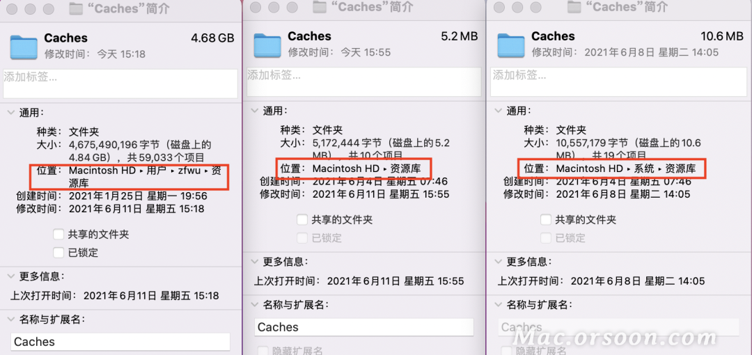 用户文件夹的资源库颜色比正常文件夹要浅。将排序方式修改为“大小”,就可以看到Containers和Caches文件夹。