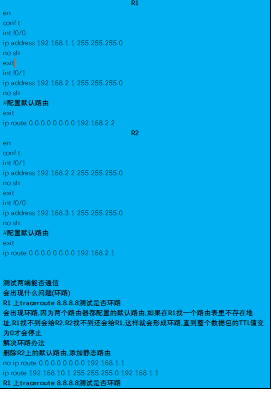 会出现环路,因为两个路由器都配置的默认路由,如果在R1找一个路由表里不存在地址,R1找不到会给R2,R2找不到还会给R1,这样就会形成环路,直到整个数据包的TTL值变为0才会停止